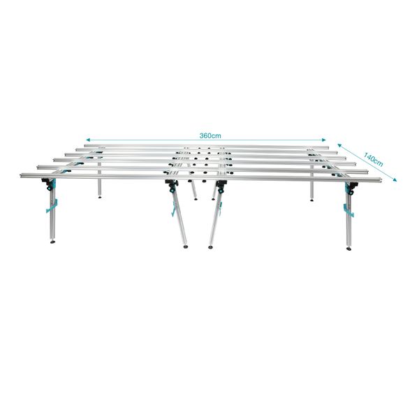 Рабочий стол для резки и работы с крупноформатной плиткой. Мобильный стол из алюминиевого профиля незаменим для резки крупноформатной плитки, так как одним из основных требований при выполнении данных работ - это идеально ровная поверхность. Легкий, компактный, устойчивый, удобный в сборке и транспортировке стол для работы с крупным форматом, отвечающий всем требованиям профессиональных плиточников. Высота: 800мм, ширина: 1400мм (лучший показатель среди аналогов), длина: 1800мм. Максимальная нагрузка составляет до 200кг. Подходит для плитки размером до 3,6м после соединения двух столов.